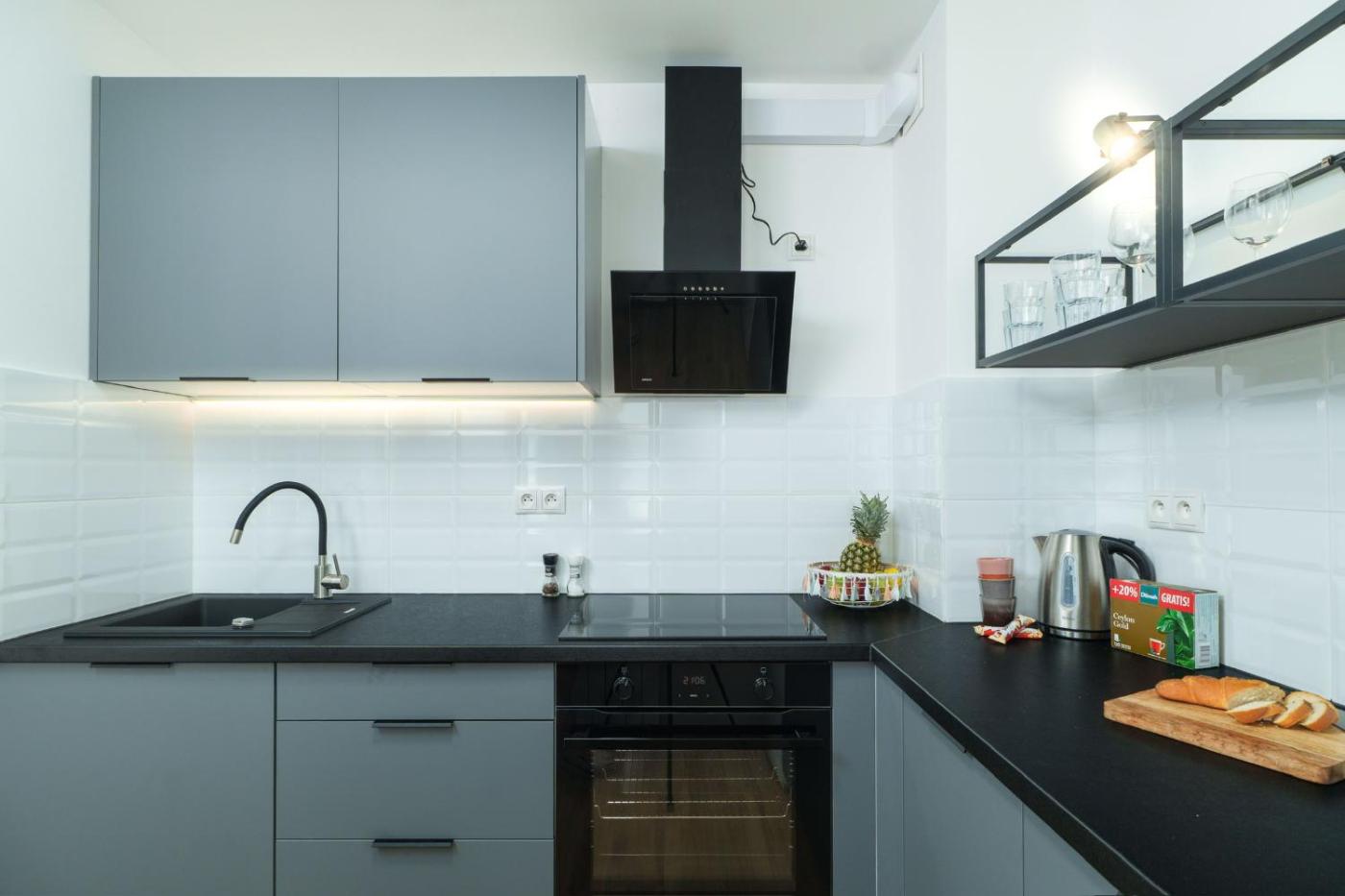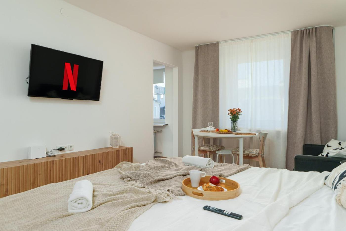 Apartament z 1 sypialnią. This apartment comes with 1 living room, 1 separate bedroom and 1 bathroom with a shower and a hairdryer. Guests can make meals in the kitchen that features a stovetop, a refrigerator, a dishwasher and kitchenware. The apartment features a washing machine, soundproof walls, a minibar, a flat-screen TV with streaming services, as well as city views. The unit has 3 beds. Apartament - 3 osobowy. Powierzchnia pokoju ok.: 35 mkw.